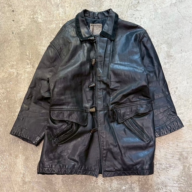 KANSAI MANのレザーコート。厚みのあるレザーを使用し、トグルボタンや切り替えなど、ブランドらしいディテールが特徴です。しっかりとした着丈があり、アウターとして汎用性の高いシルエットです。 ⸻ サイズ・詳細 ・肩幅:約52cm ・身幅:約52cm ・袖丈:約50cm ・着丈:約79cm ・素材:レザー ・カラー:ブラック ⸻ コンディション 全体的に使用感があり、シミや傷、擦れがあります。レザー特有の経年変化が出ていますが、着用に問題のある大きなダメージはありません。 ⸻ ご購入前にご確認ください ・ヴィンテージレザーのため、キズ・シミ・擦れなどが複数あります。状態を必ずご確認ください。 ・採寸は平置きでの実寸です。多少の誤差はご了承ください。 ・撮影環境やモニターにより色味が異なる場合があります。