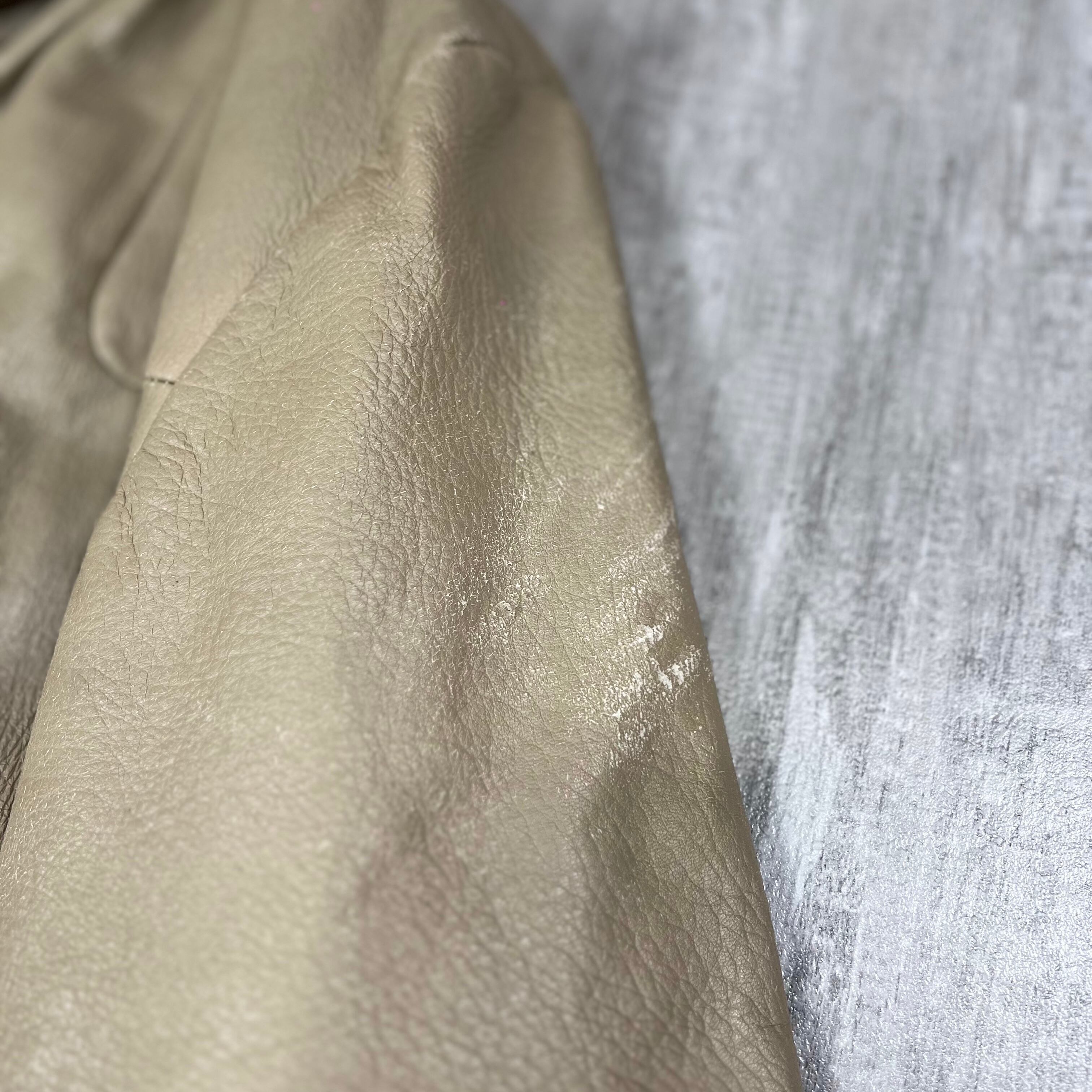 アイボリーカラーの鹿皮のレザーパーカー。
