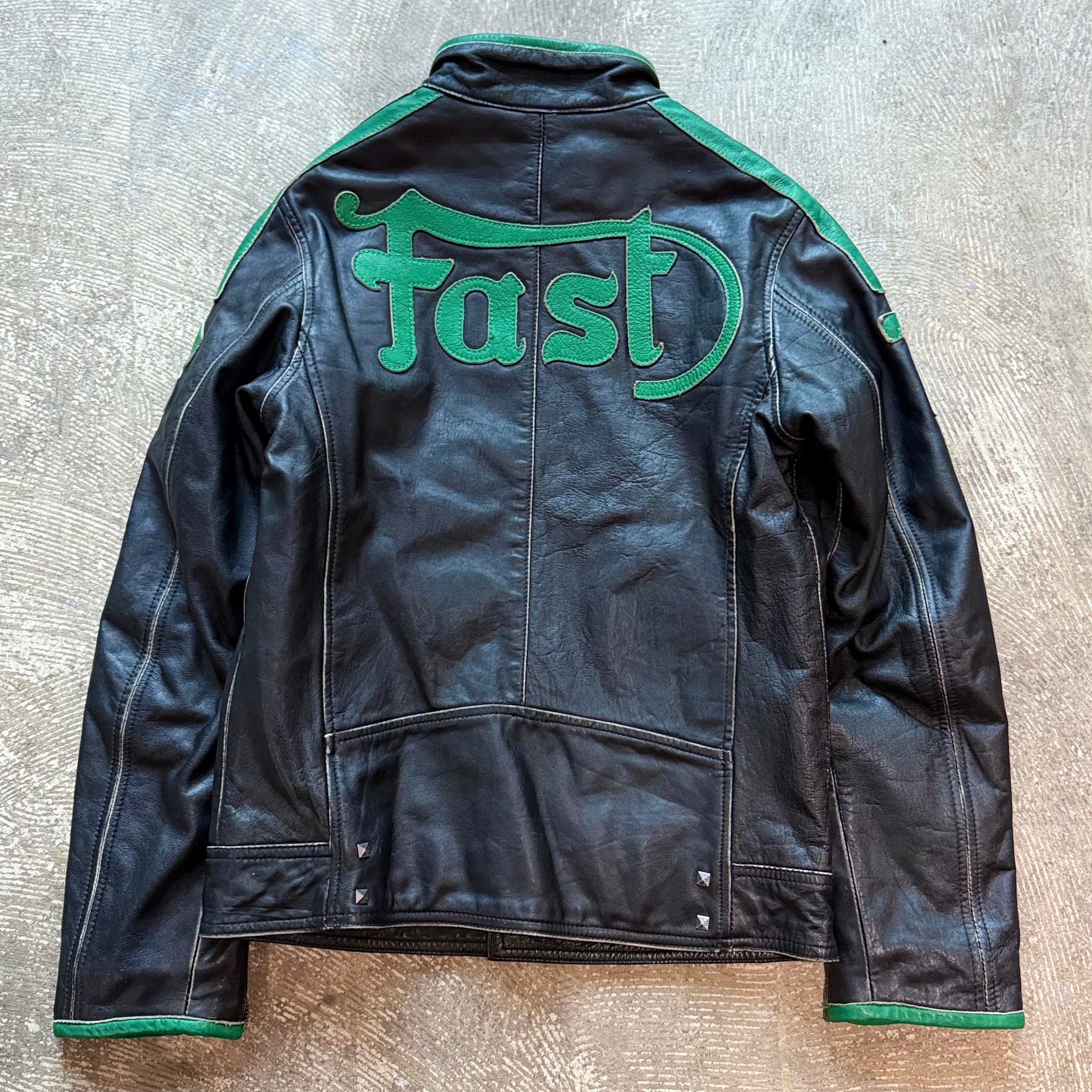 ブラックレザーをベースに、グリーンのラインワーク、ナンバリング、バックの「Fast」ロゴ刺繍が強烈なインパクトを放つ一着です。