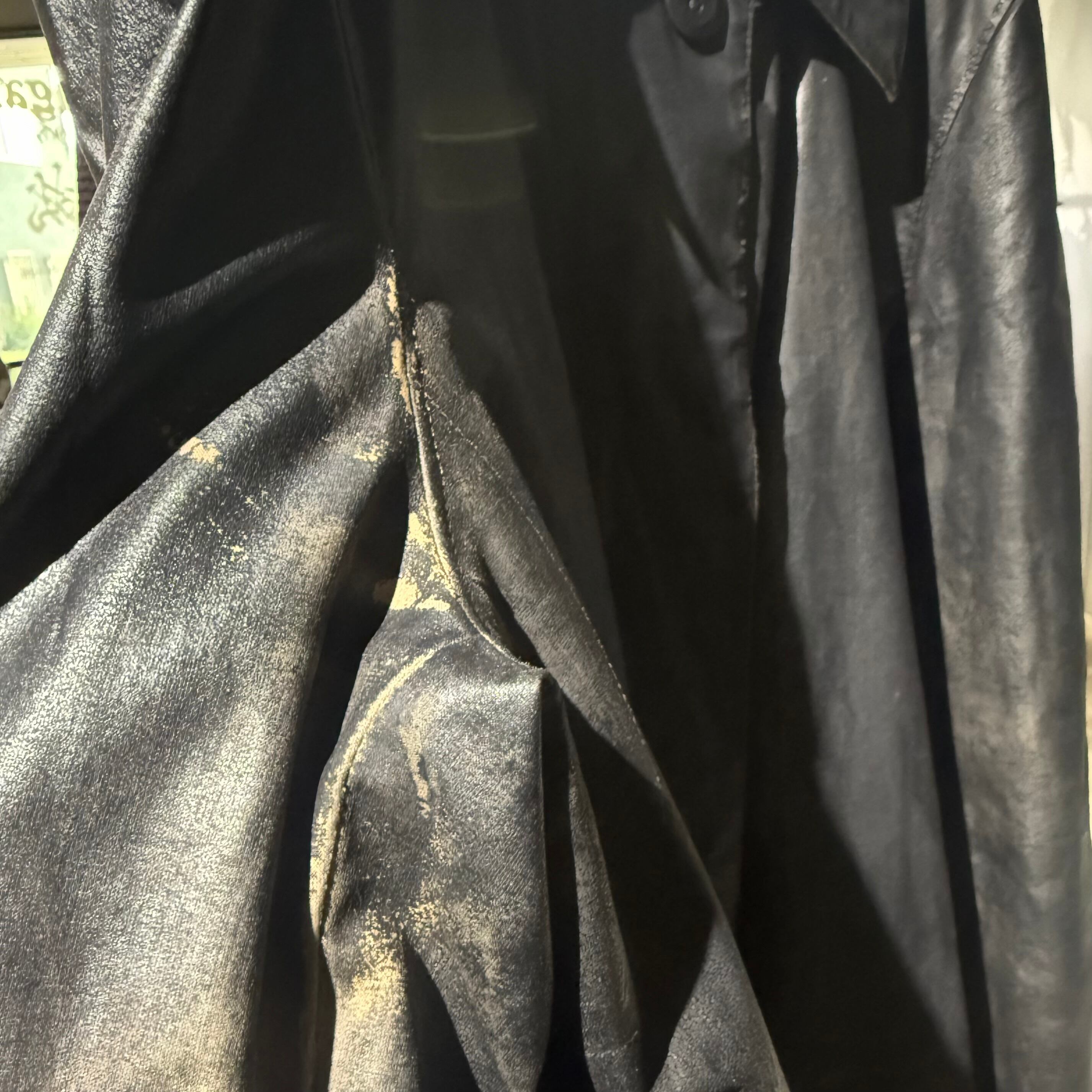 Alessandro Pungetti期のプロダクトはミリタリーやワークの文脈をベースにしながらも、素材開発とフィニッシュ加工に強い個性が宿ります。本個体はコットンボディにウレタンコーティングを施したマックコート型。光の当たり方で表情が変わる独特のフェードとシワ感が魅力で、現代のテック〜モードスタイルにも自然に溶け込みます。ロング丈ながら身幅はすっきりとしており、インナーを調整することで幅広い季節に対応可能。アーカイブらしい素材の“味”を楽しめる一着です。