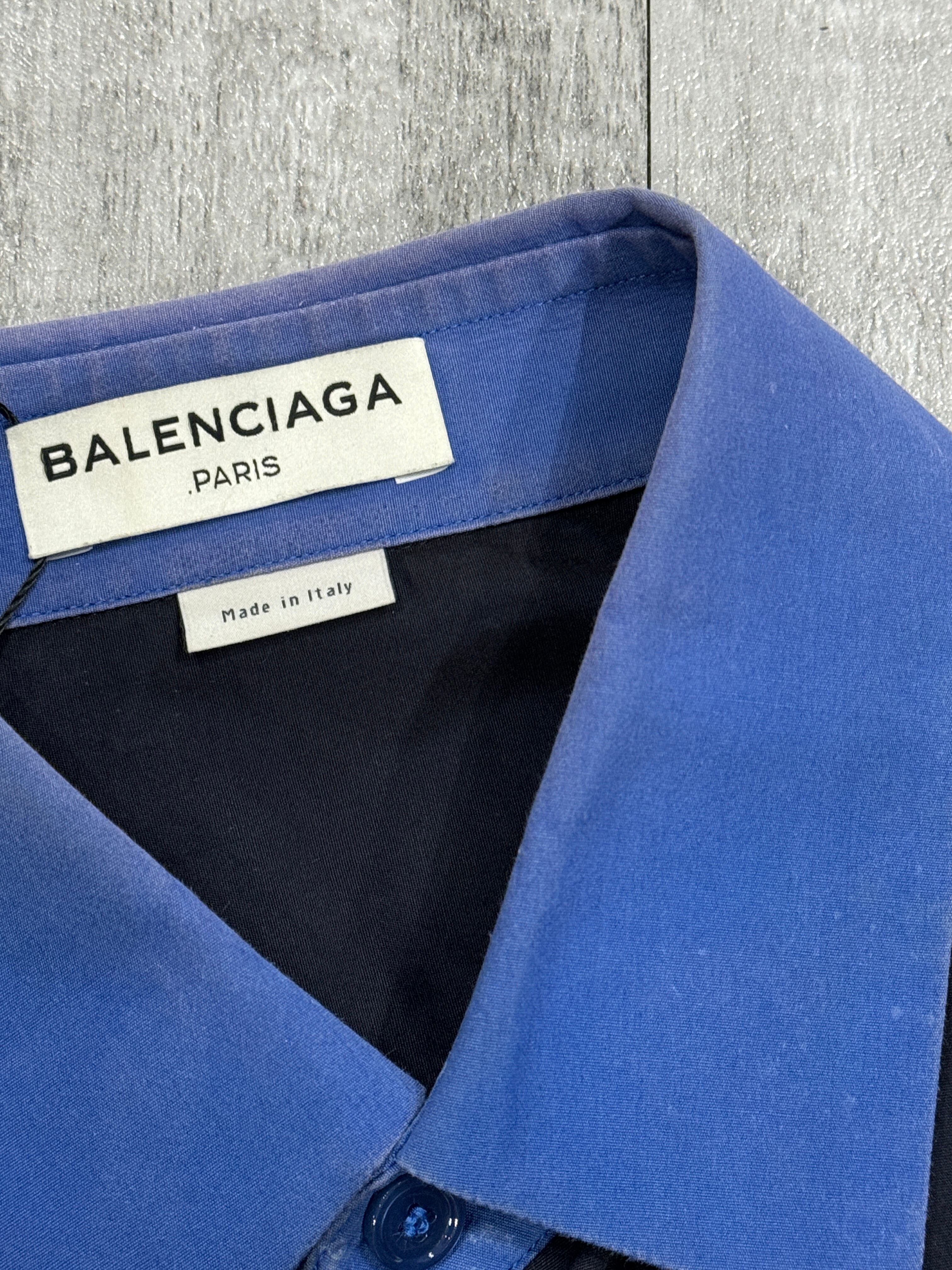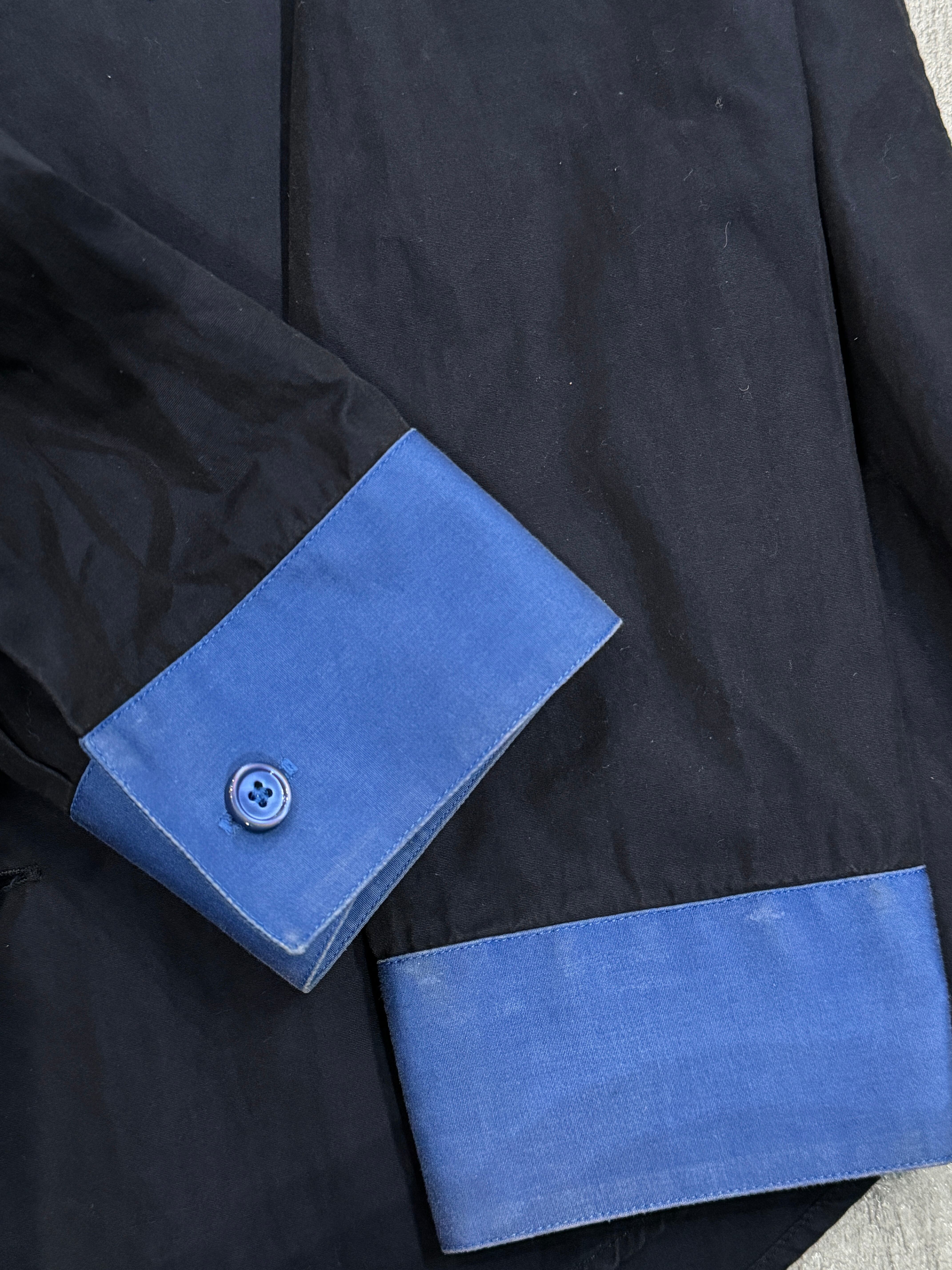 ブルーで切り替えられた襟とカフス、ボタンがポイントで目を引くアイテムです。